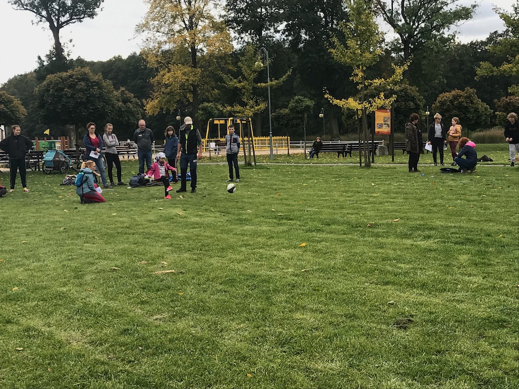 Wielkie zaskoczenie to gra miejska. Pobiliśmy swój rekord. Udział wzięło 57 osób w 11 zespołach. Przenosiliśmy się w czasie ale na początku ćwiczyliśmy swoją cierpliwość przy okazji wędkowania na Karpidołku. Co za akcja – czekasz godzinę i nic…. tak nikt nie złowił ryby. Na szczęście na finał gospodarz Karpidołka poczęstował nas wspaniałymi kanapkami z własnej roboty pasztetem oraz super kiełbaską z dziczyzny. Nie było pospiechu, ale rywalizacja w konkurencjach była naprawdę silna. W rezultacie wygrała ekipa Chodź na dwór i to oni zgarnęli komplet 6 dysków i puchar przechodni. Jesteśmy spokojni o to czy i jak użyją dysków… 🙂